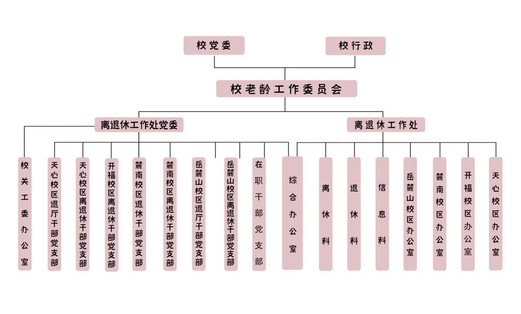 离退休工作处是学校党政领导下管理离退休工作的职能部门,是学校老龄工作委员会的办事机构,负责全校离退休工作的管理、指导、协调以及相关政策的制定和督促执行。设有处党委和处行政,下设综合办公室、离休科、退休科、信息科、岳麓山校区办公室、麓南校区办公室、开福校区办公室和天心校区办公室。此外,学校关工委办公室挂靠在离退休工作处。