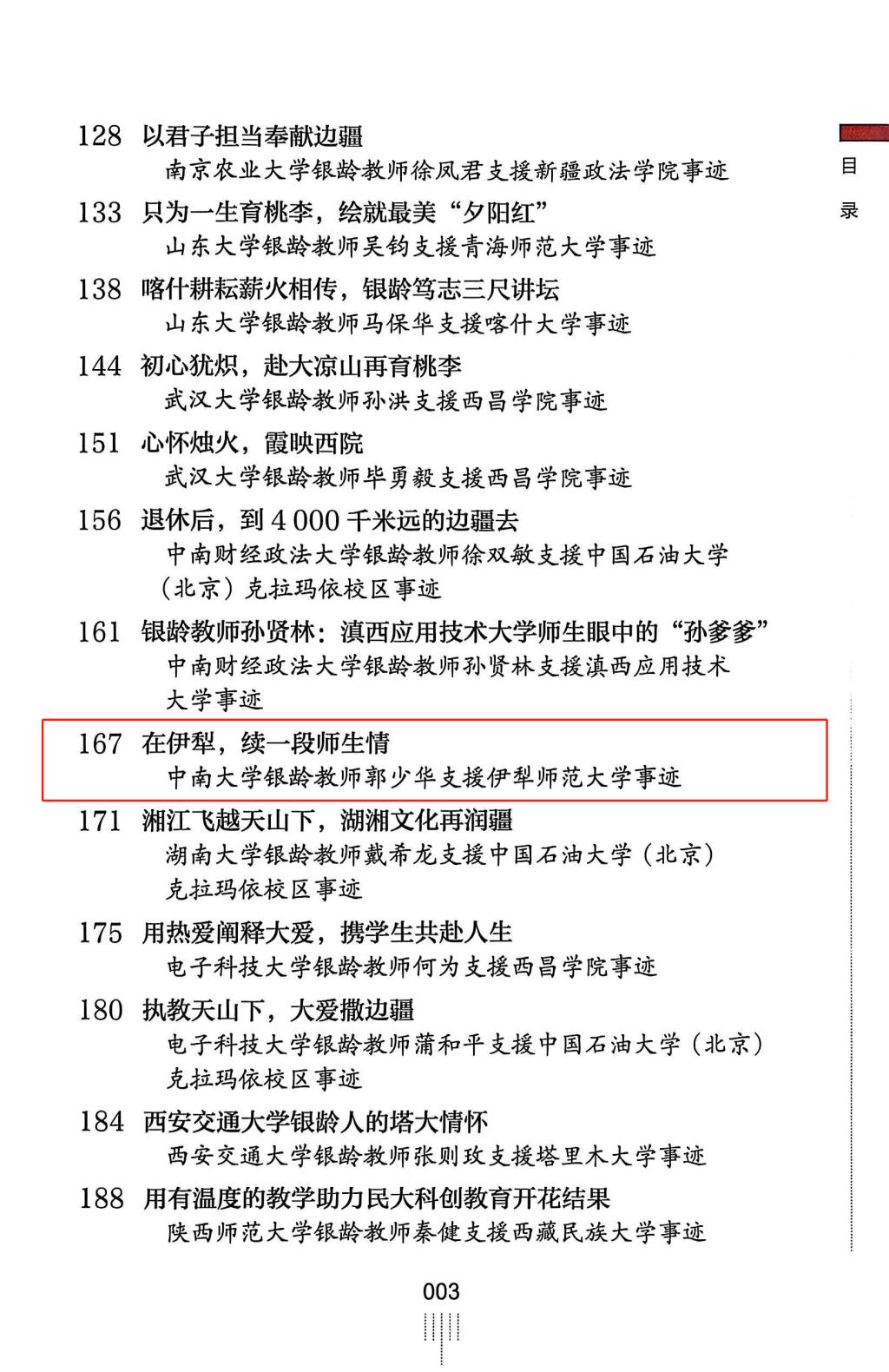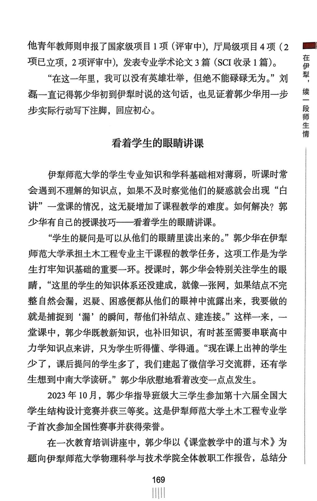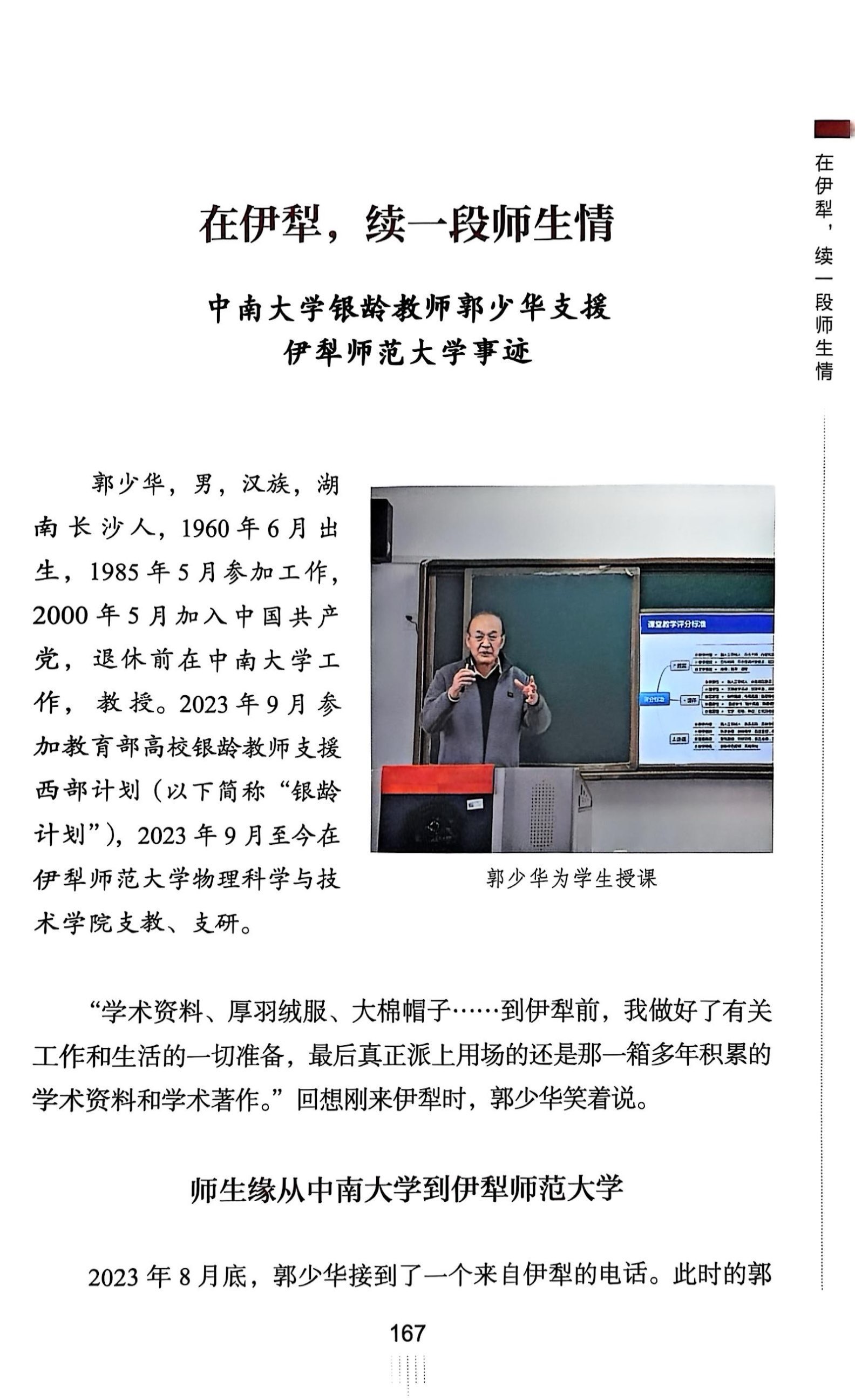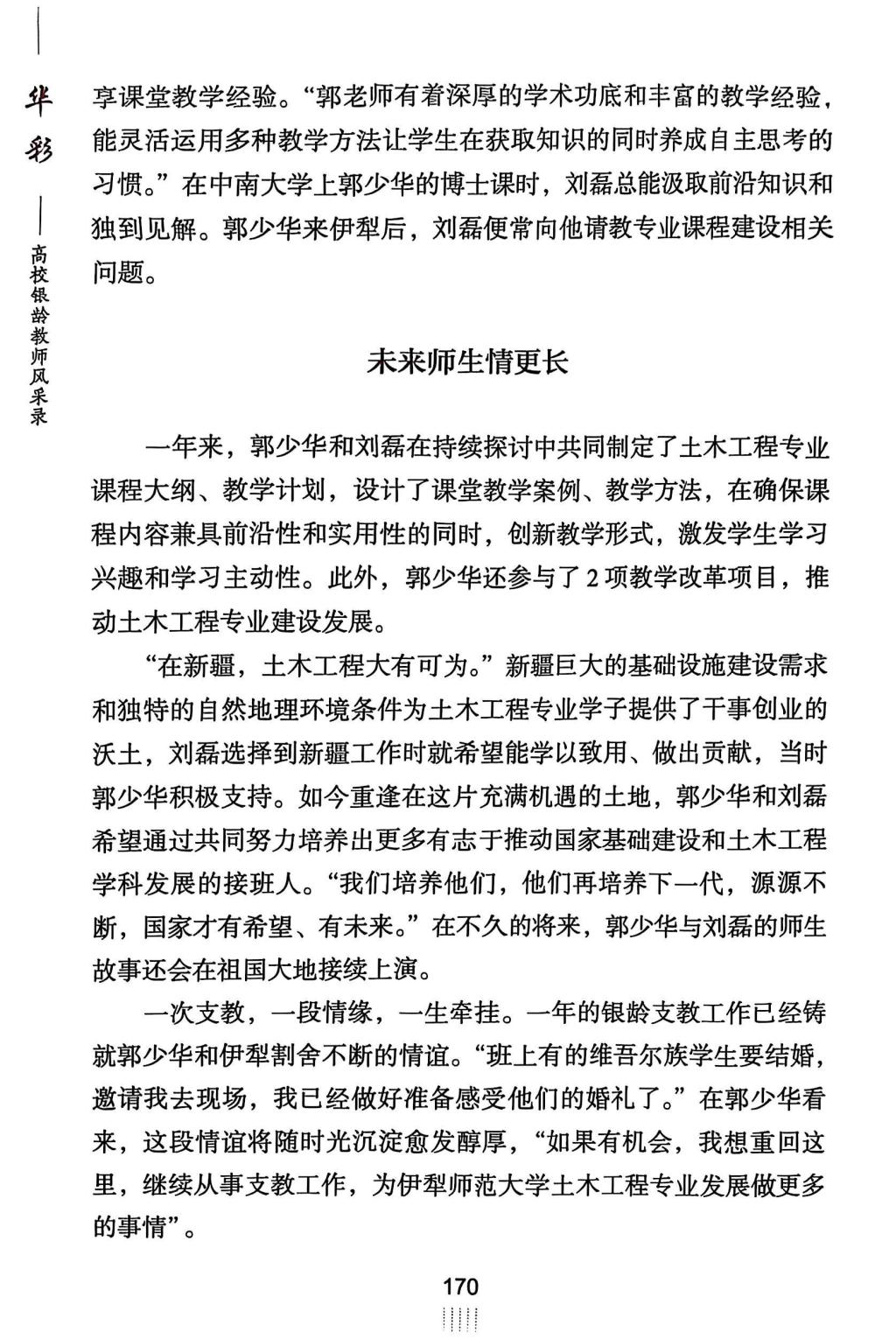 近日,教育部离退休干部局出版《华彩——高校银龄教师风采展示录》,我校银龄教师土木工程学院郭少华教授在伊犁师范大学支研支教的事迹获专篇报道,银龄教师自动化学院罗三定教授、计算机学院王国才教授支教情况在“河池学院银龄教师工作记”中被提及,充分展现我校银龄教师风采。