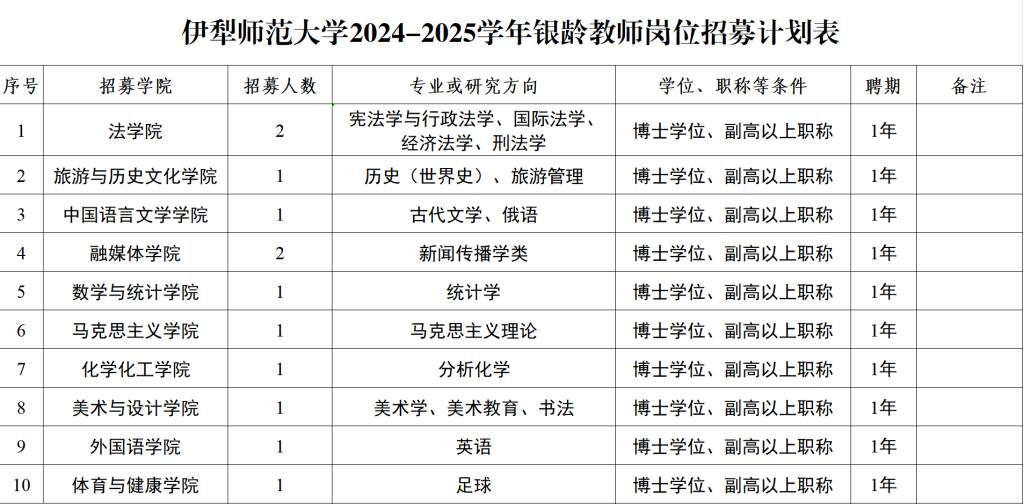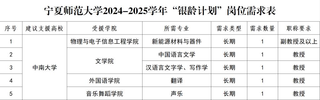 4.岗位需求详见《伊犁师范大学2024-2025学年银龄教师岗位招募计划表》及《宁夏师范大学2024-2025学年“银龄计划”岗位需求表》。